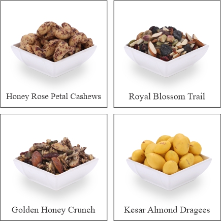 Roasted Salted Cashews, Roasted Salted Almonds, Salted Pistachios, Sahi PanchMeva, Honey Rose Petal Cashews,